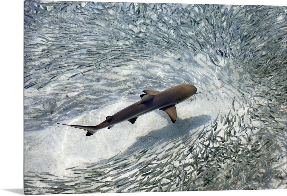 <p>Baby black-tip reef shark being surrounded by a school of silver sprats in a shallow lagoon, Maldives, Indian Ocean, Asia</p>