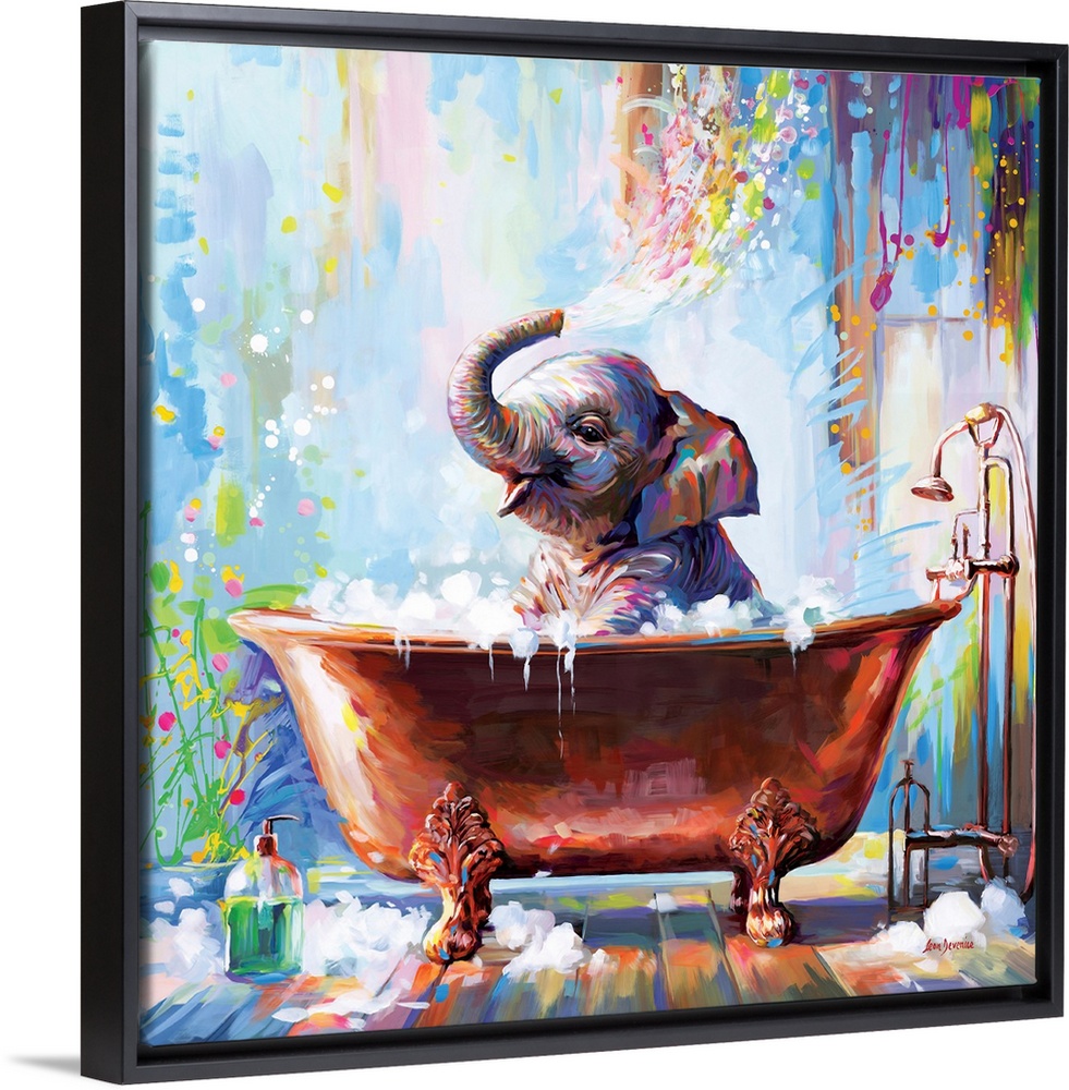 <p>Colorful baby elephant playfully spraying water in a bathtub surrounded by bubbles.</p>