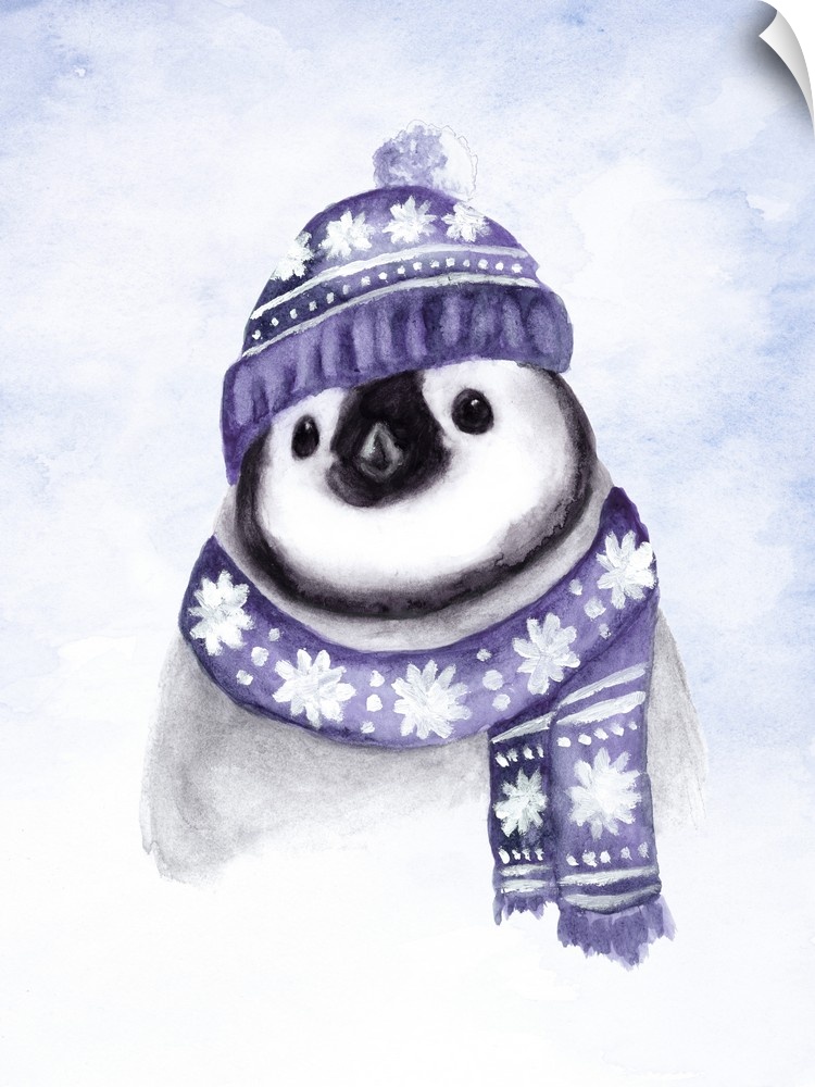 <p>Adorable illustration of a Emperor Penguin chick wearing a purple winter hat and scarf.</p>