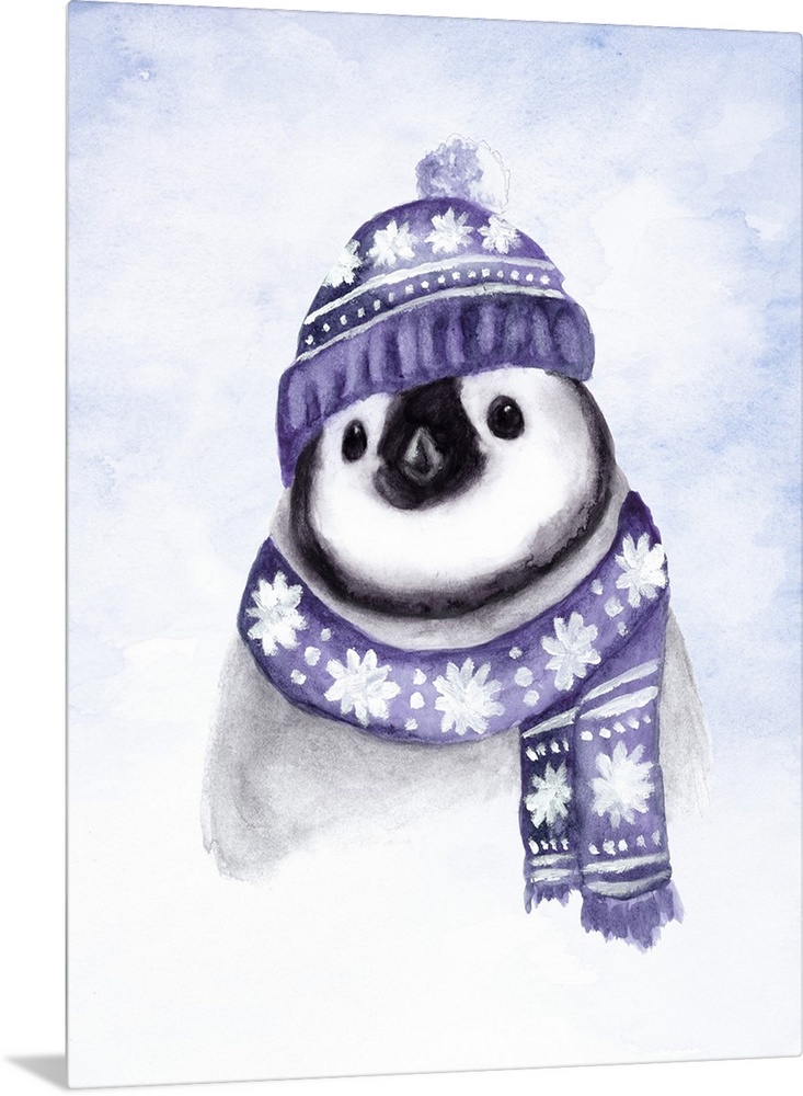 <p>Adorable illustration of a Emperor Penguin chick wearing a purple winter hat and scarf.</p>