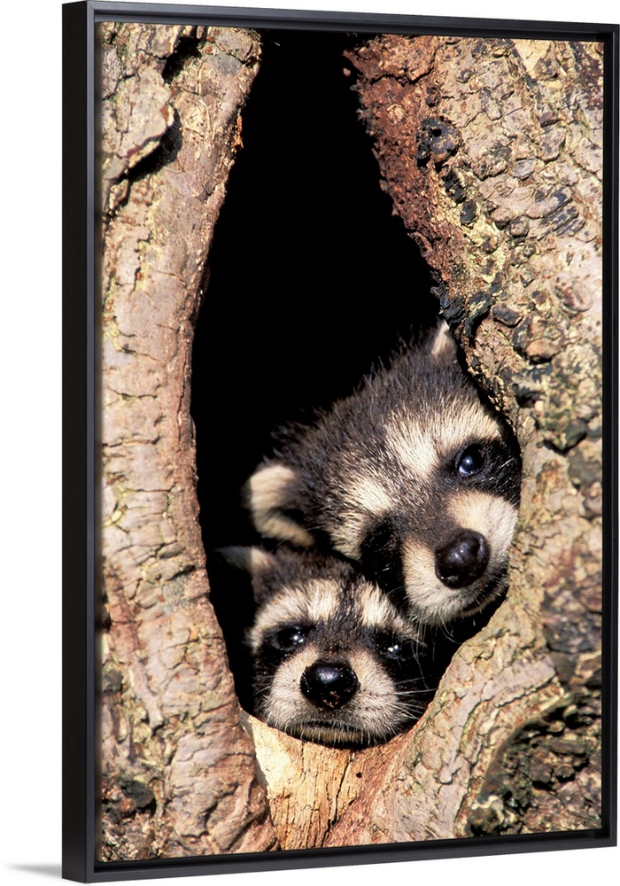 <p>Baby raccoons in tree cavity (Procyon lotor).</p>