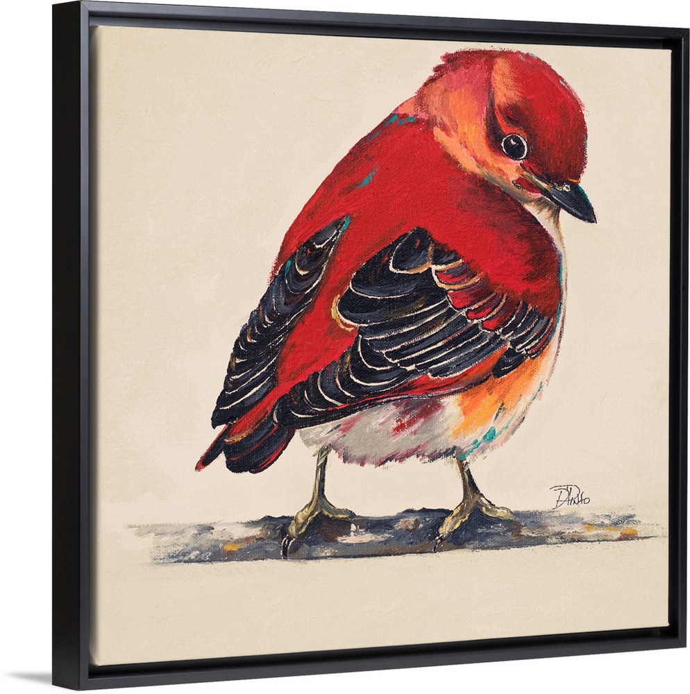 <p>Painting of a bright red little bird perched on a twig.</p>