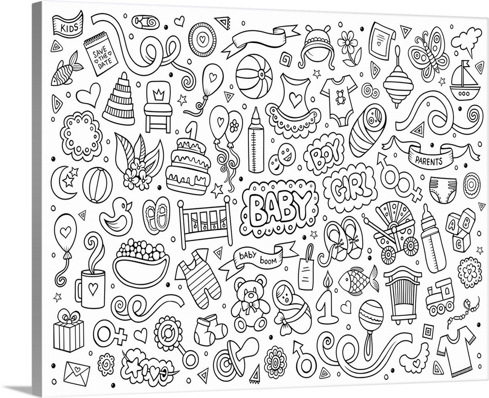 <p>An assortment of objects celebrating a new baby, such as bottles and booties. Perfect for Coloring Canvas.</p>