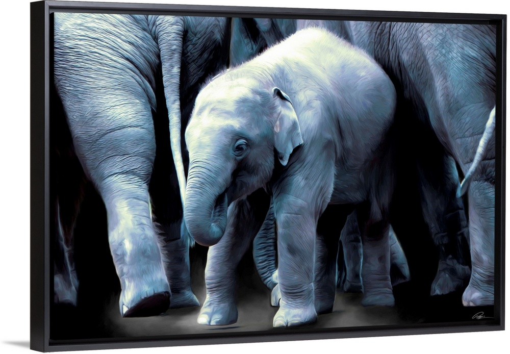 <p>Contemporary animal art of a baby elephant in a herd of adult elephants.</p>