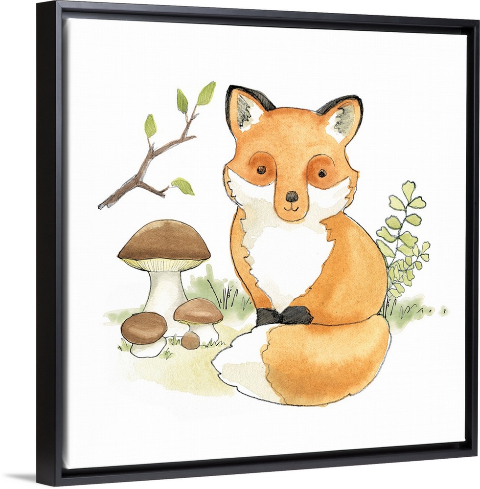 <p>Watercolor painting of a baby fox surrounded by plants and mushrooms.</p>