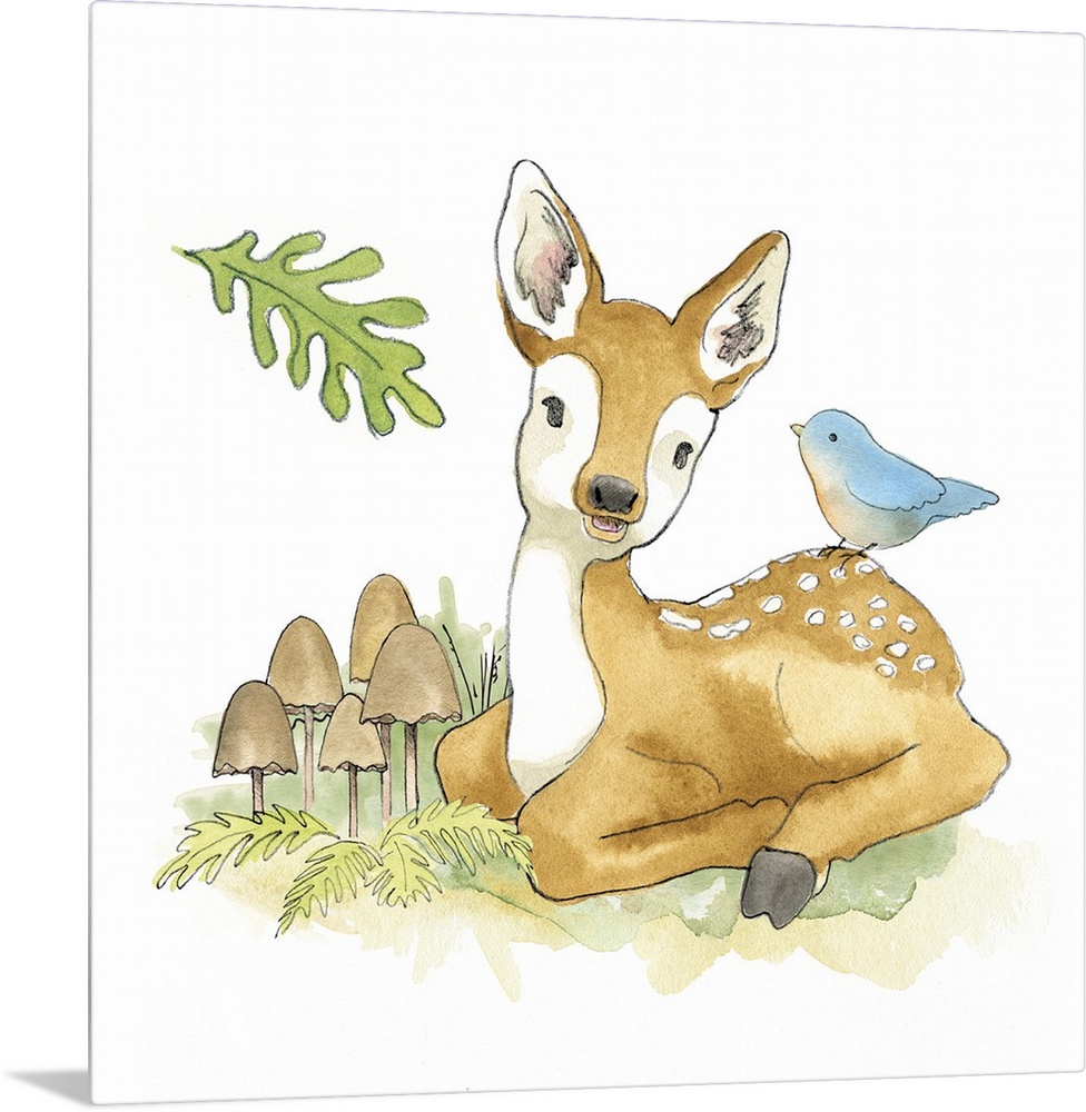 <p>Watercolor painting of a fawn with a blue songbird surrounded by plants and mushrooms.</p>