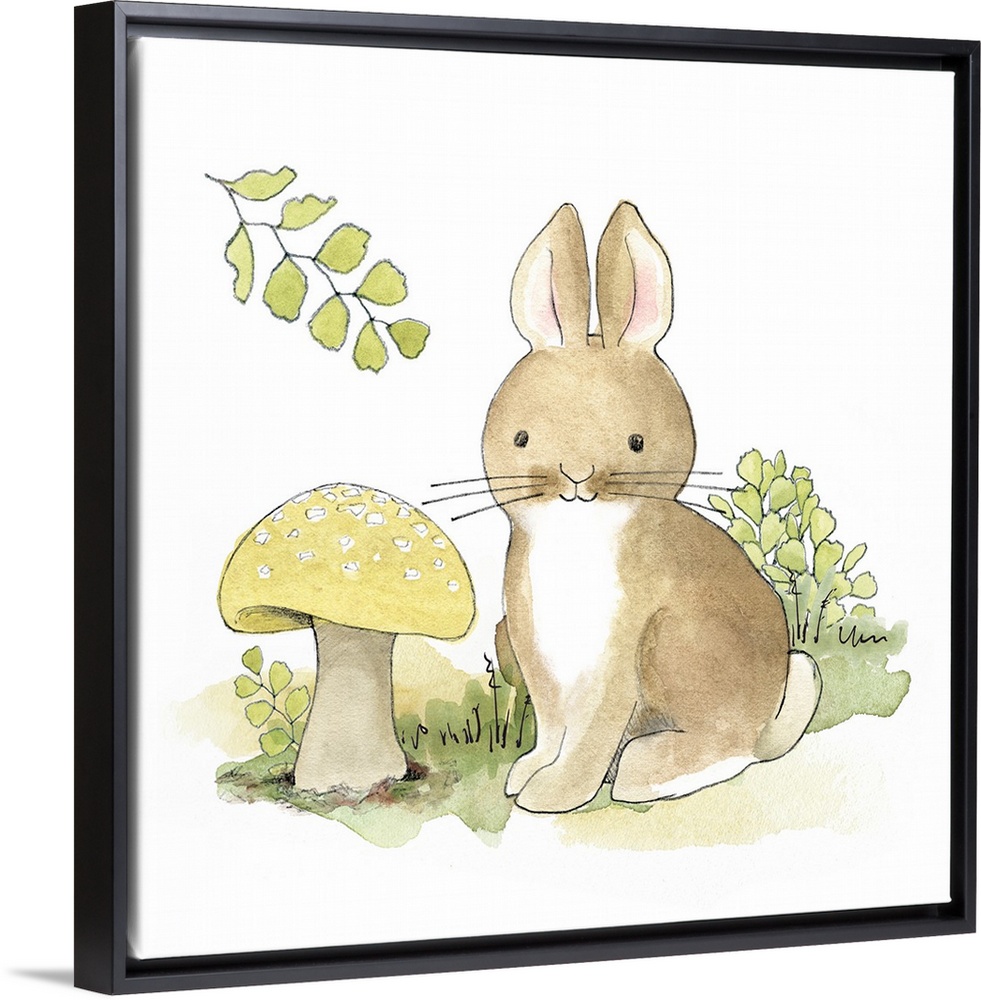 <p>Watercolor painting of a baby bunny surrounded by plants and a giant mushroom.</p>