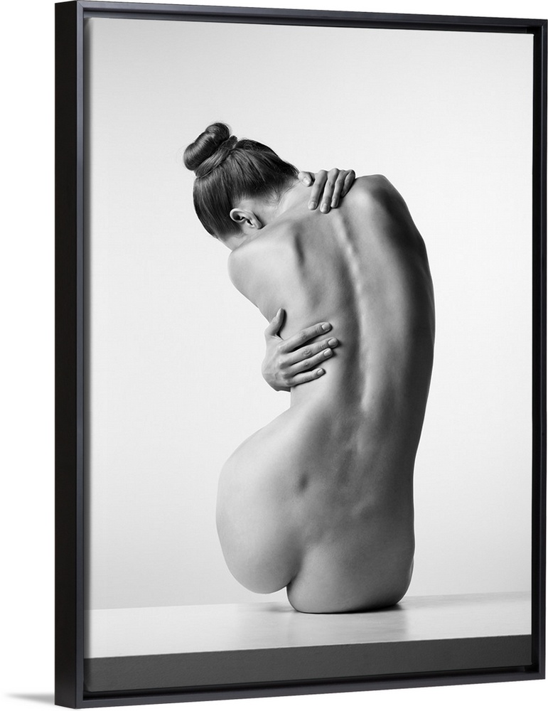 <p>Black and white fine art photograph of a nude woman from behind creating movement with her body.</p>