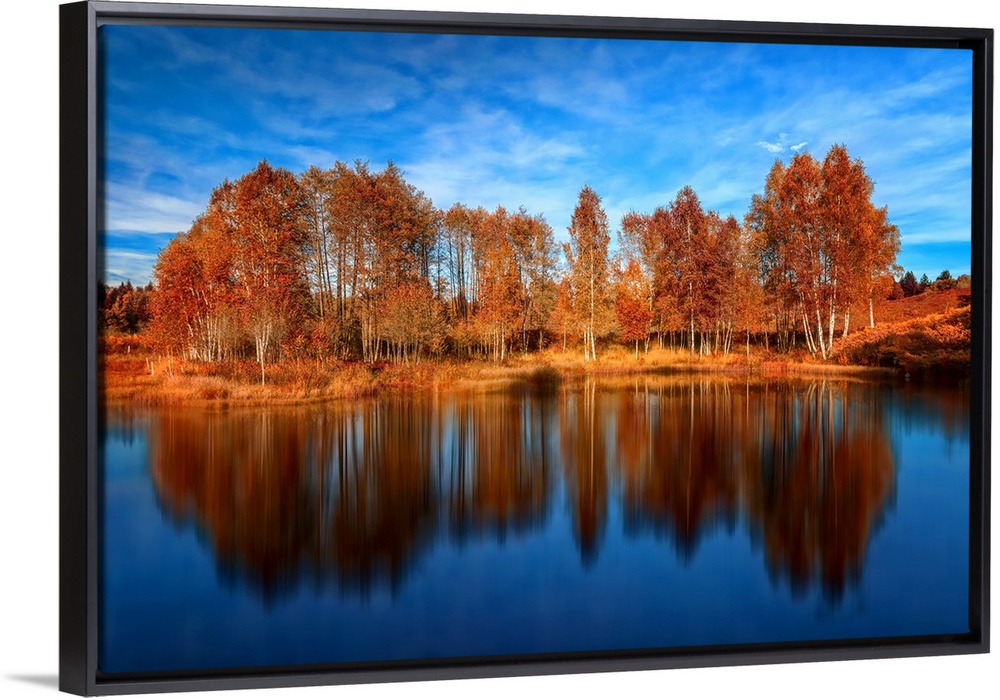 <p>Bright orange trees reflected in the deep blue water of a lake.</p>