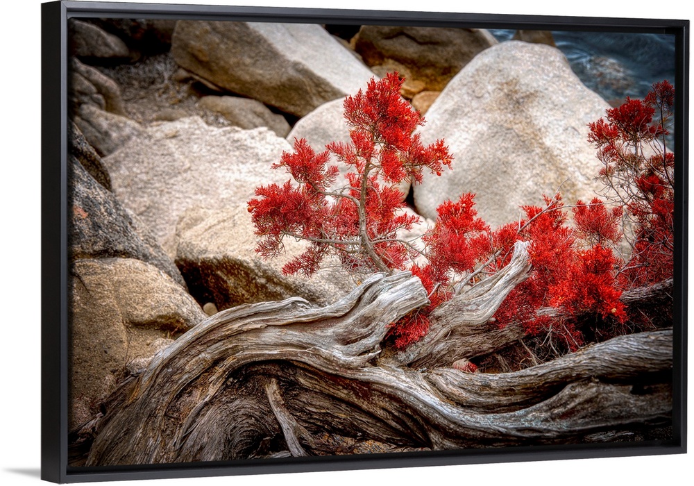 <p>A gnarled piece of driftwood lies among large, smooth rocks, with vibrant red foliage growing from it. The scene juxtaposes the harsh textures of the wood and stone with the delicate, colorful leaves.</p>