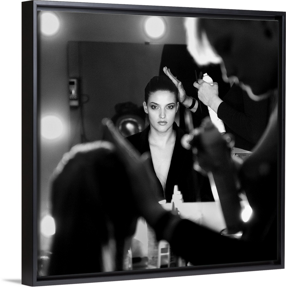 <p>A woman has her hair styled in a dressing room.</p>