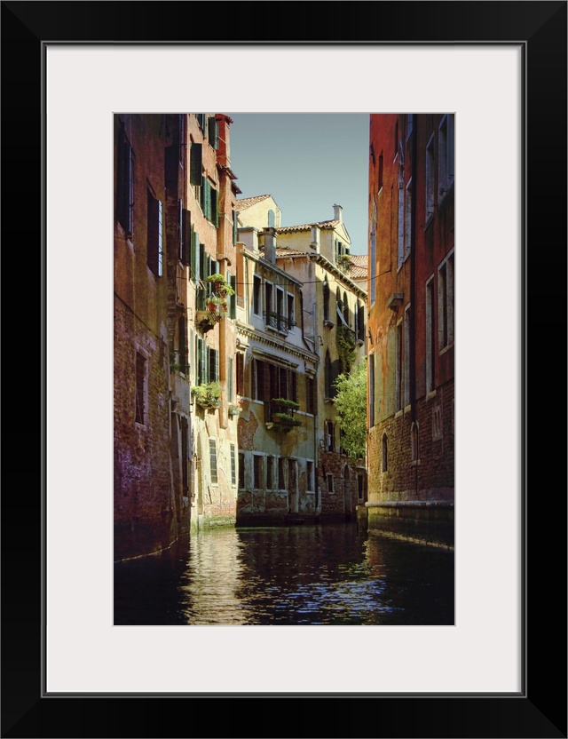 <p>A pretty back street canal in Venice Italy shows exposed brick buildings and shuttered windows.</p>
