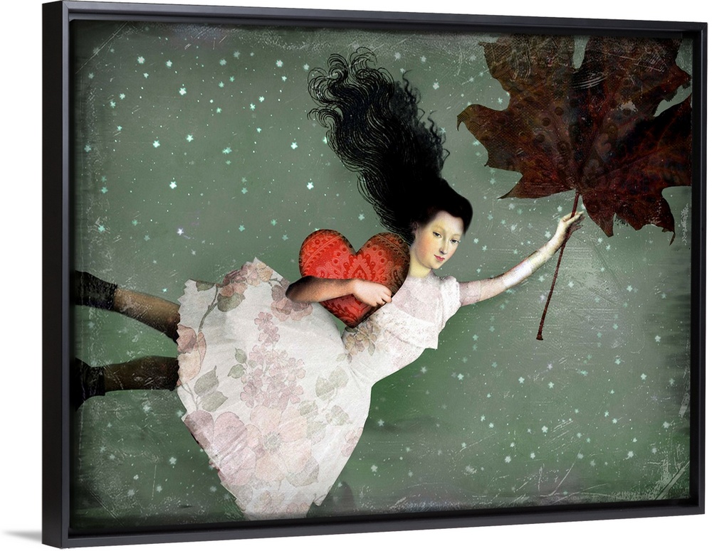 <p>Painting of a woman in white holding a heart and large leaf as she is flying through the sky.</p>