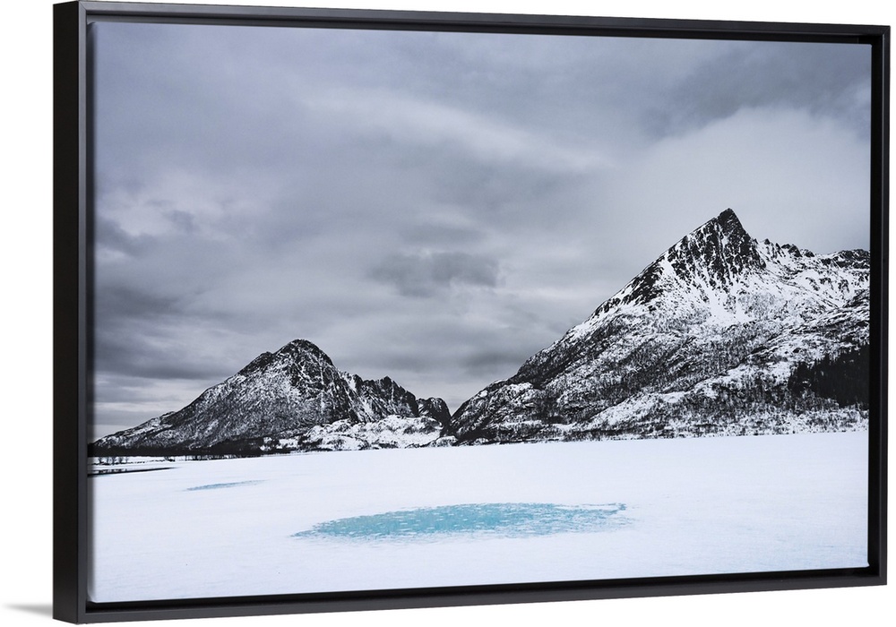 <p>Snow-covered landscape with mountains around a frozen lake</p>