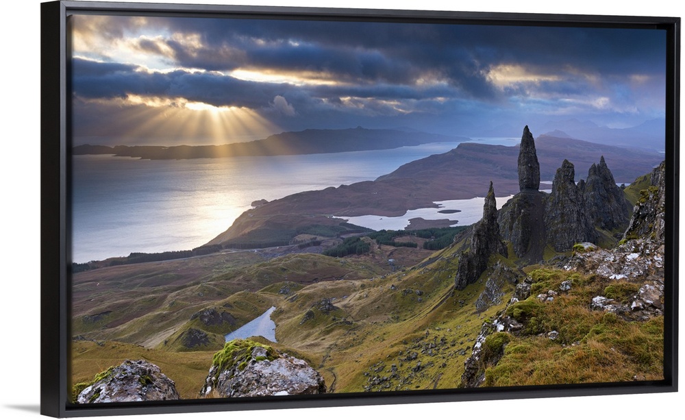 <p>Pointed rocks on a hillside overlooking a lake with sunlight shining through the clouds.</p>