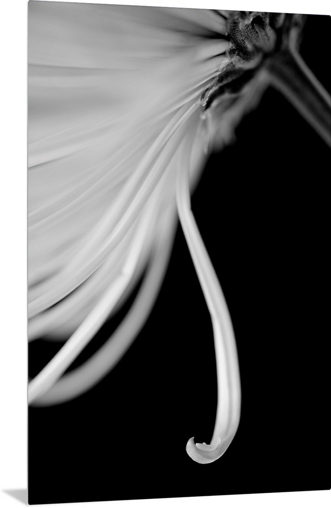 <p>This closely taken photograph is of the bottom side of a flower with a single petal hanging below the rest.</p>