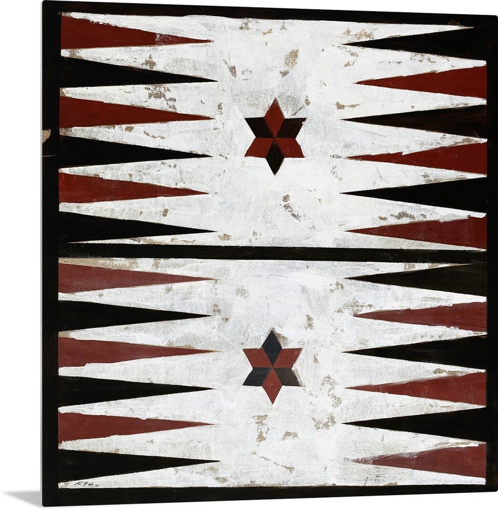<p>Painting of a rustic looking backgammon board surrounded by a black border.</p>