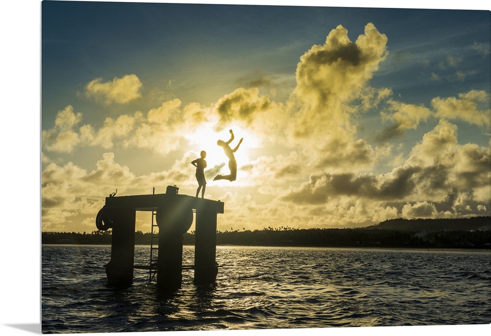 <p>Backlit local boys jumping into the water of the lagoon of Wallis from a platform, Wallis and Futuna, Pacific</p>