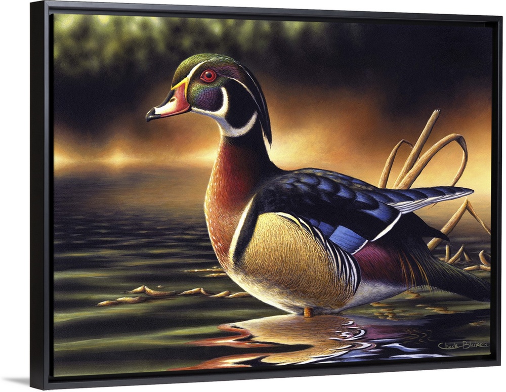 <p>A contemporary idyllic painting of a duck standing in shallow water.</p>