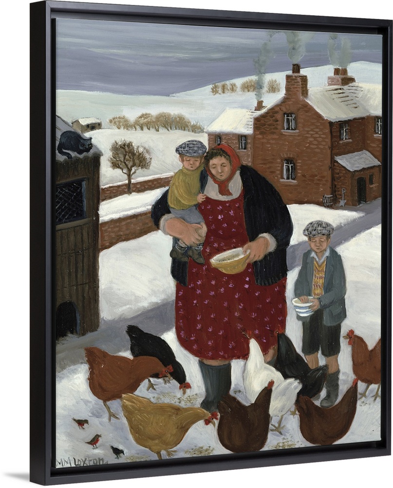 <p>Contemporary painting of a woman and two boys feeding chickens in the winter.</p>