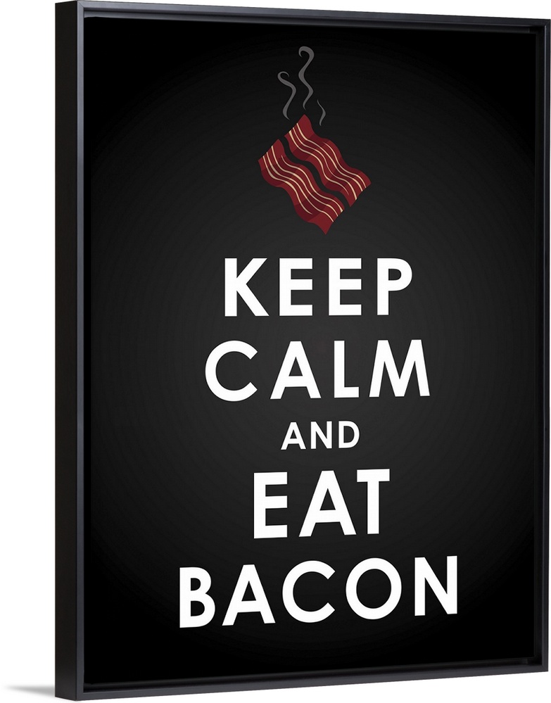 <p>Kitchen decor art depicting sizzling bacon with the text "Keep calm and eat bacon" underneath, on a black background.</p>