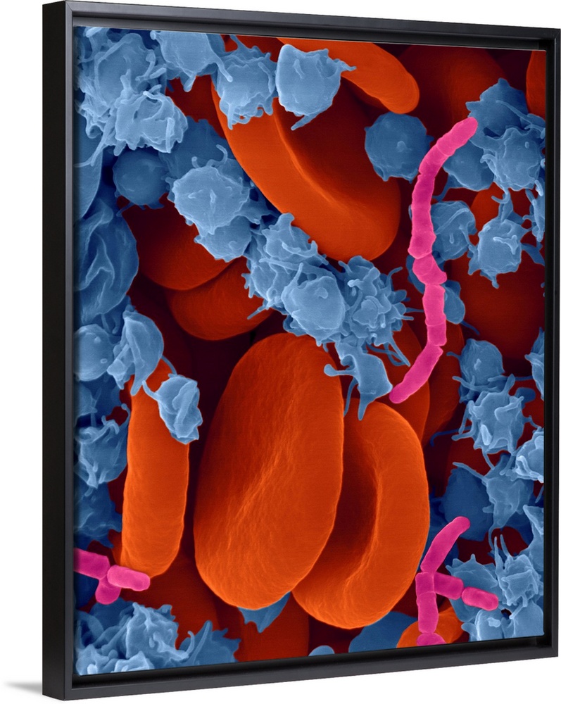 <p>Bacterial blood infection caused by a rod shaped bacterium, composite coloured scanning electron micrograph (SEM). Short chains of a bacillus bacterium amongst the red blood cells and platelets from the circulatory system. When a strain of harmful bacteria gets into the bloodstream, the resulting infection is called bacterial sepsis, or bacteraemia (commonly known as blood poisoning). Multiplication of the harmful bacteria in the blood stream can cause death. When there is a high amount of toxins produced by bacteria in the blood, a septic shock may occur. Septic shock is a highly dangerous condition in which body tissues are damaged. This kind of infection can be serious, but it can usually be successfully treated with antibiotics, if caught early. Use of vaccines against the most common bacteria that cause infections, has made bacterial sepsis less common. Magnification: x1,600 when shortest axis printed at 25 millimetres.</p>