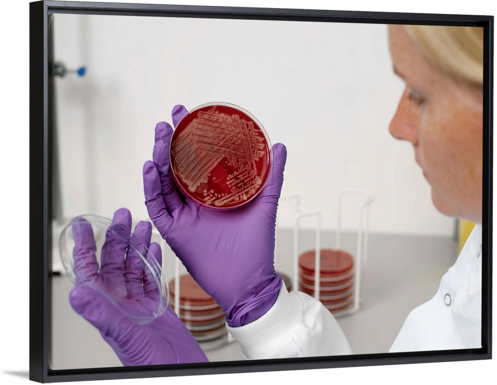 <p>MODEL RELEASED. Bacterial contamination tests. Laboratory worker examining a petri dish that was used to culture human tissue samples. Any bacteria or other micro-organisms found growing in the petri dish will need to be identified. The petri dishes contain nutrient media on which micro- organisms will grow if placed in the right conditions. The tissues being tested range from blood to bone.</p>