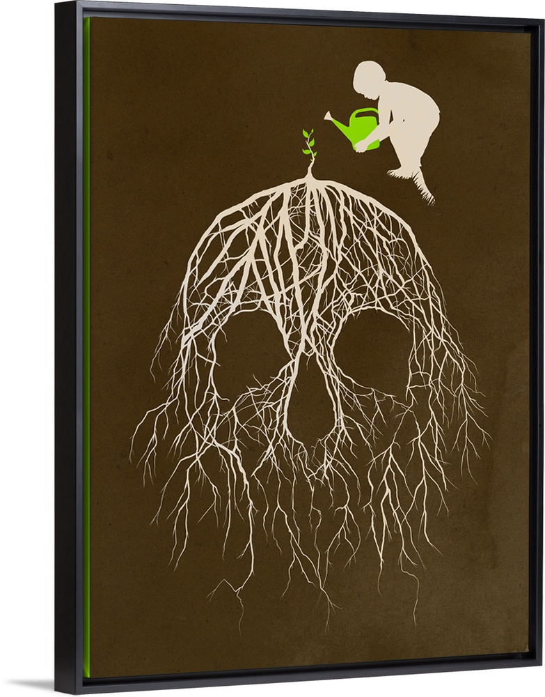 <p>Contemporary, large wall art of a small silhouette of a person in the top right with a watering can. The person is watering a small plant at the top of the image that has a large root system below that projects the shape of a skull.</p>