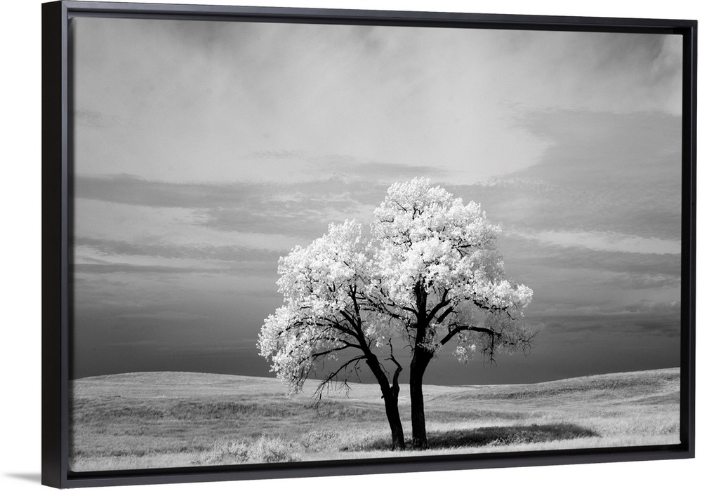 <p>Infrared photography image of a tree in a field in Badlands National Park in South Dakota.</p>