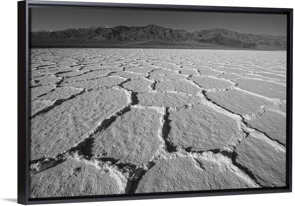 <p>Black and white image of dry salt flats in Death Valley, California.</p>