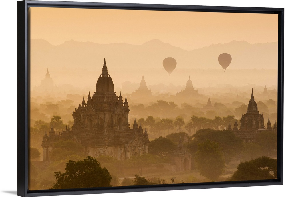 <p>Bagan, Mandalay region, Myanmar (Burma). Pagodas and temples with balloons at sunrise.</p>