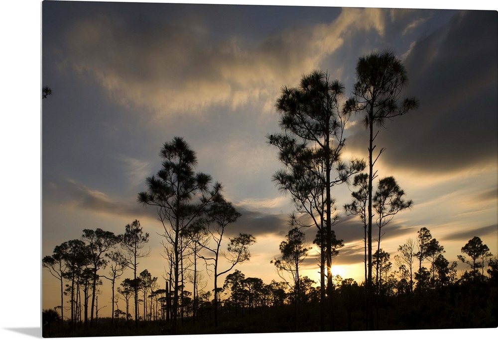 <p>Bahamas, Grand Bahama Island, Lucaya National Park, Setting sun silhouettes Caribbean Pine Trees</p>