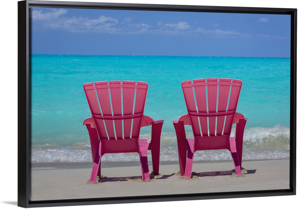 <p>Bahamas, Little Exuma Island. Pink chairs on beach.</p>