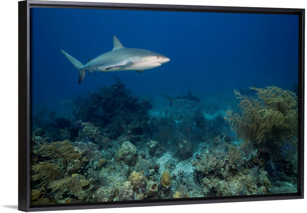 <p>Bahamas, New Providence Island, Caribbean Reef Sharks (Carcharhinus perezi) swimming in Caribbean Sea</p>
