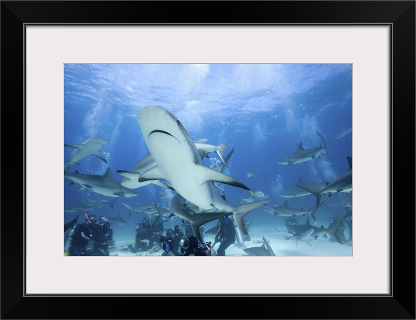 <p>Bahamas, New Providence Island, Scuba divers and Caribbean Reef Sharks during Stuart Cove's shark feeding dive</p>