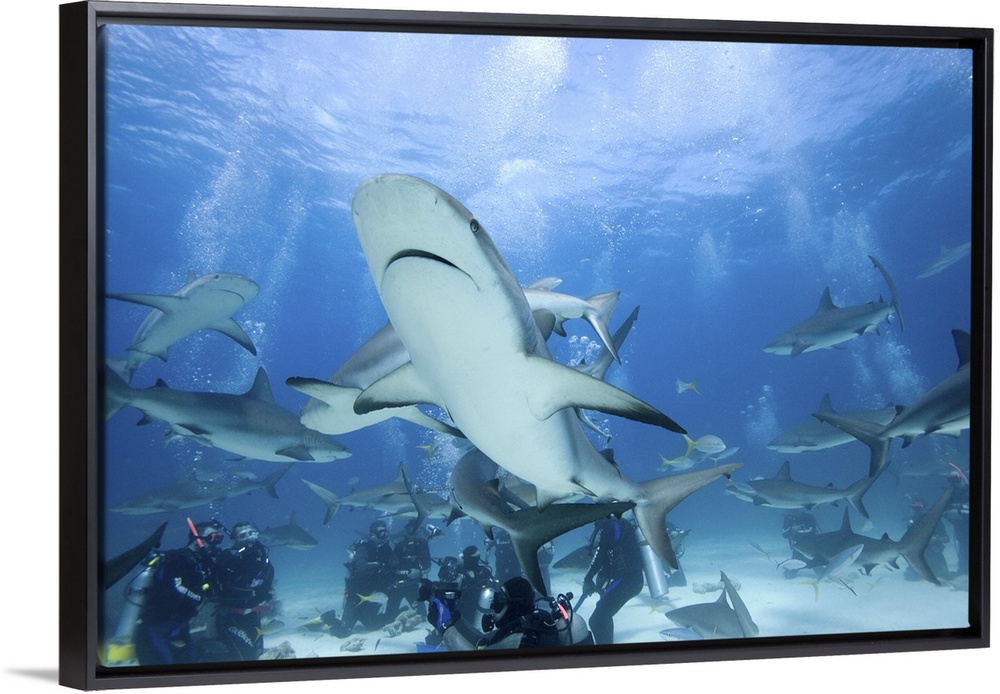 <p>Bahamas, New Providence Island, Scuba divers and Caribbean Reef Sharks during Stuart Cove's shark feeding dive</p>