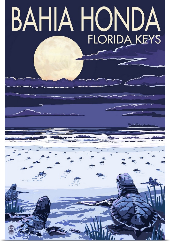 <p>Baby sea turtles emerge from the nest where they were hatched, scurry across the moonlit sand and into the ocean water in this retro inspired artwork.</p>