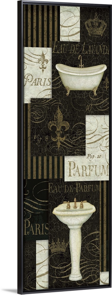 <p>Contemporary artwork of bathroom fixtures and text on panel.</p>