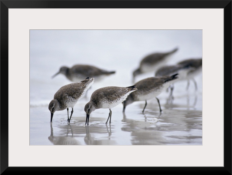 <p>Bairds Sandpipers, Calidris bairdii, feeding on a beach. Likely juveniles. Siesta Key Beach, Siesta Key, Florida. USA</p>