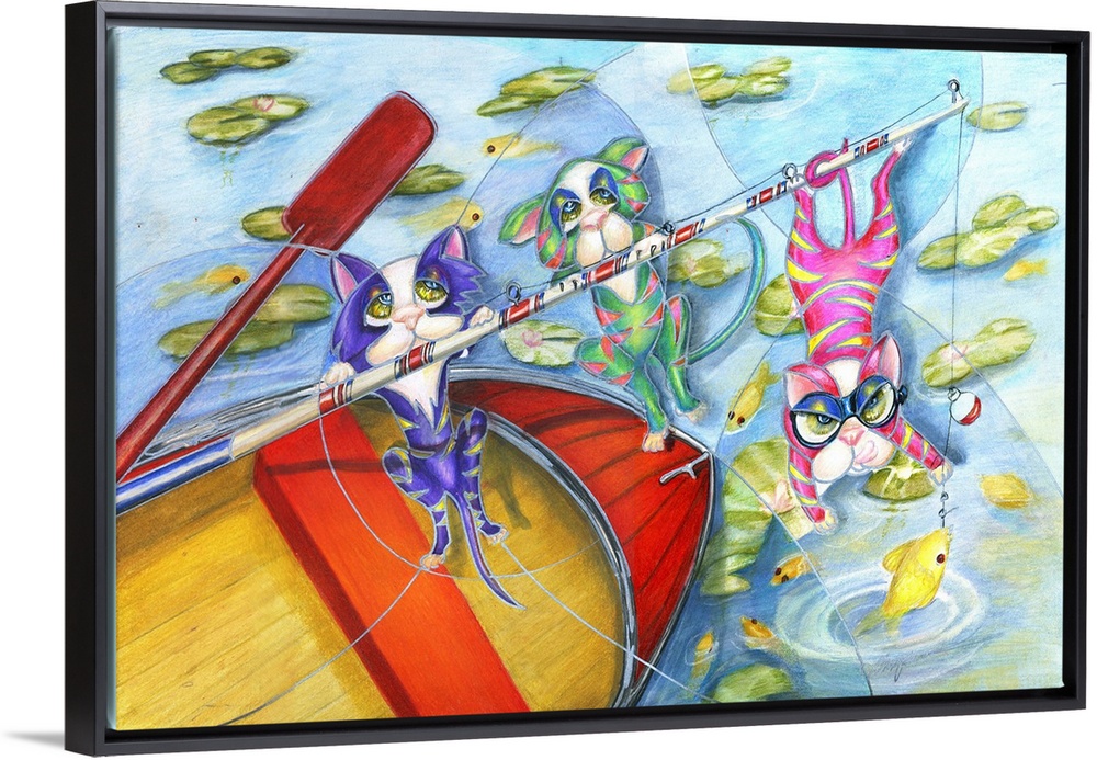 <p>Contemporary artwork in the style of cubism of three cats on a boat in bold colors.</p>