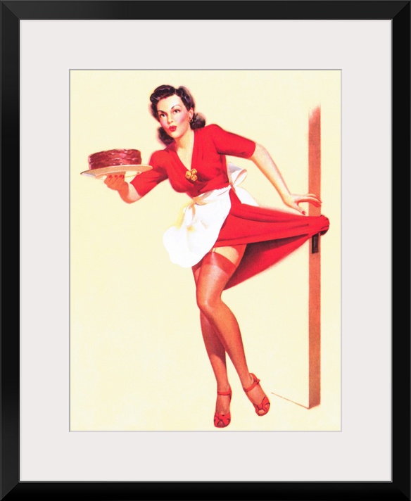 <p>Vintage 50's pin-up girl holding a cake with her dress caught on the door knob.</p>