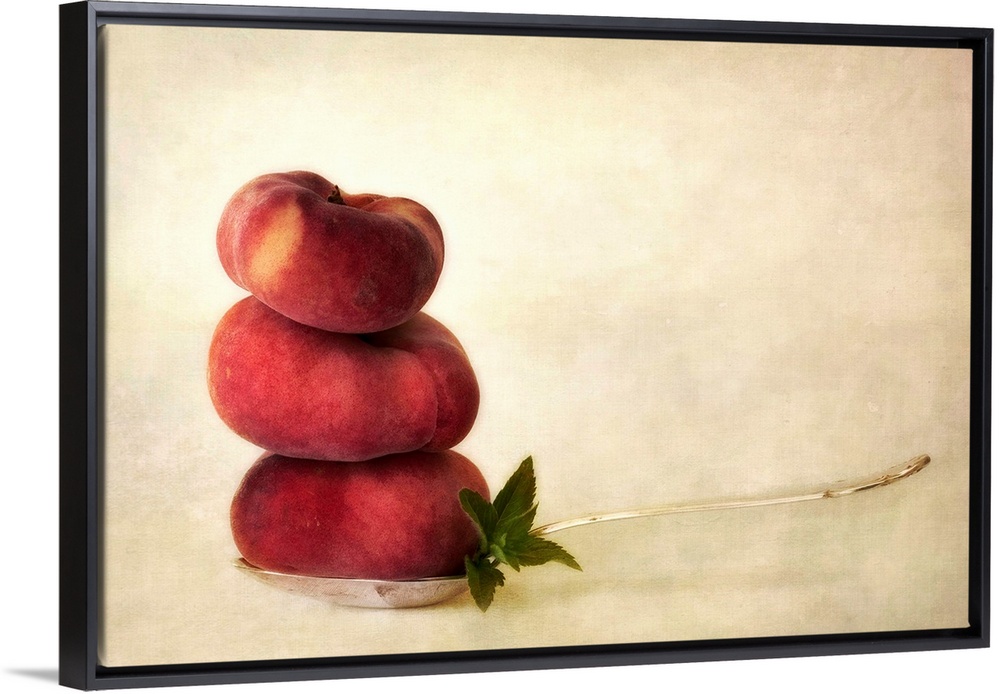 <p>Balancing act with vineyard peaches and some peppermint leaves on a tablespoon</p>