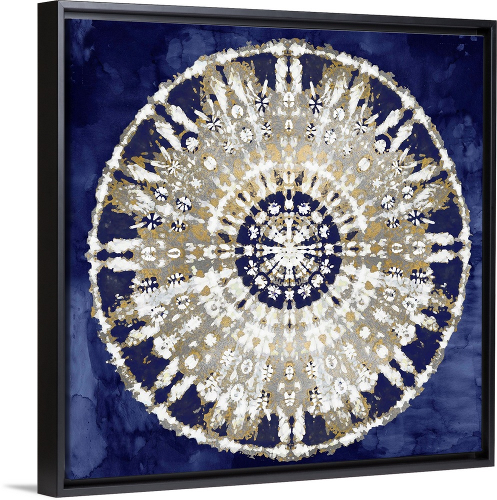 <p>Square abstract decor with a white, gold, and silver mandala on an indigo background.</p>