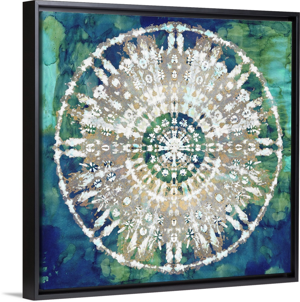 <p>Square abstract decor with a white, gold, and silver mandala on a blue and green watercolor background.</p>