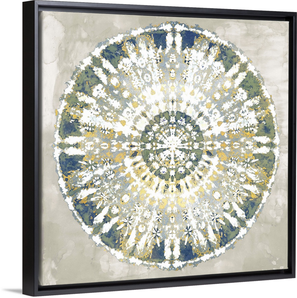 <p>Square abstract decor with a white, gold, green, blue, and silver mandala on a gray background.</p>