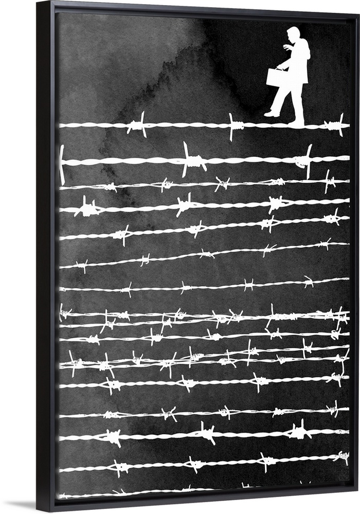 <p>A figure of a man walks across a string of barb wire in this modern artwork.</p>