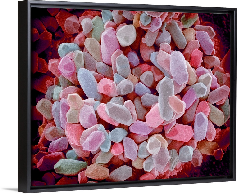 <p>Balancing stone from inner ear. Coloured scanning electron micrograph (SEM) of crystals of calcium carbonate on the surface of an otolith. An otolith or otoconium is a calcified stone that is found in the otolith organs of the inner ear. They are attached to sensory hairs, and, when the head tilts, the movement of the stones causes nerve impulses that form the basis of the sense of balance.</p>