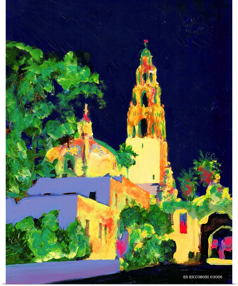 <p>Decorate your wall with Balboa Park at Night by RD Riccoboni. The California Building and tower is illuminated against a deep blue evening sky. Electric colors pop in this cityscape.</p>