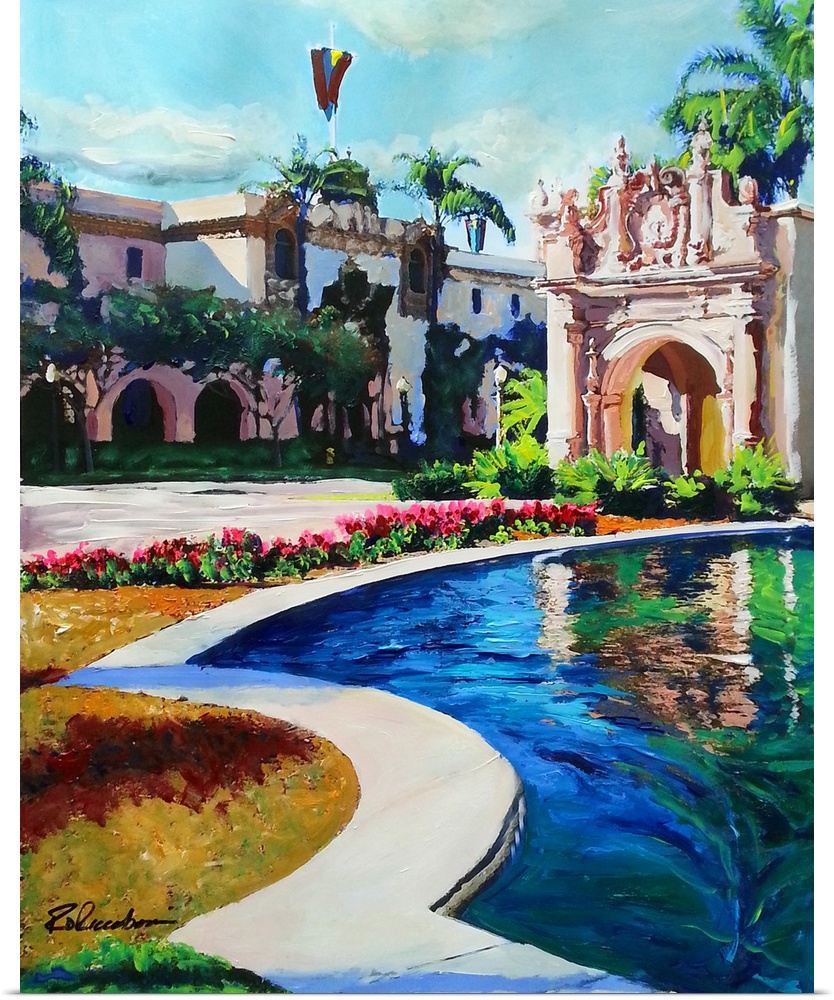 <p>Lily Pond and Home Economy Building Arcade Entrance, painting by RD Riccoboni. Spanish colonial revival architecture along the Prado of Balboa Park in San Diego, California.</p>