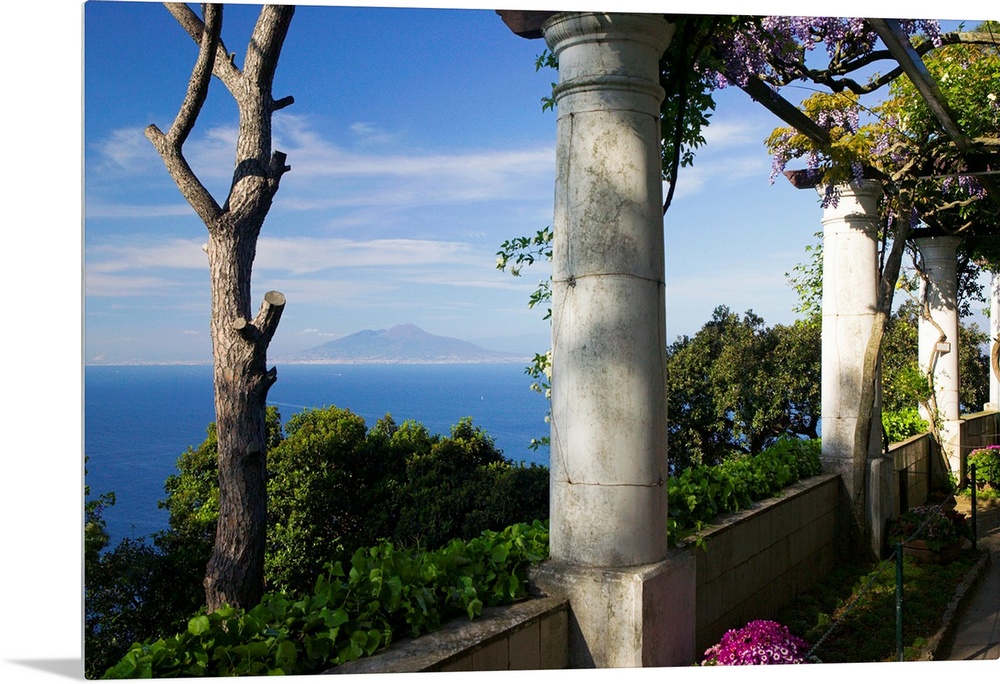 <p>Large photograph taken from a European terrace filled with columns and bushes as it overlooks the Tyrrhenian Sea containing an island in the far distance.</p>